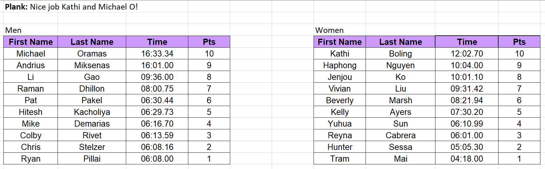 * Whenever possible--we awarded points based on a top 10. Ties took slots points from the top 10. Only a tie in the 10th place you add more names to the list.